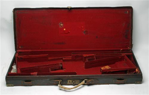 A BRASS-CORNERED LEATHER DOUBLE GUNCASE, fitted for 30in. barrels, lined with maroon baize, central brass lock (key missing), handle & straps missing.