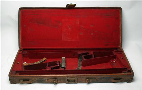 A LEATHER DOUBLE GUNCASE, suitable for 30in. barrels, lined in maroon baize, brass lock ( key missing and in need of attention), straps & handle missing.