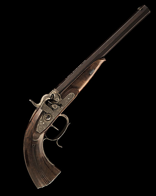 A 32-BORE PERCUSSION RIFLED TARGET PISTOL, no visible serial number,