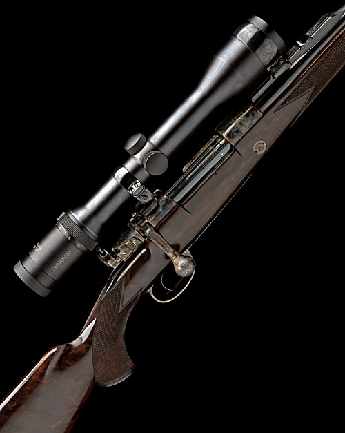23 3/4in. nitro barrel engraved 'MAX ERN IN SCHLEBUSCH', scroll engraved and partially matted sight rib, open sights and one folding leaf sight, ramp-mounted bead fore-sight, receiver (with thumb cutout) mounted with a Swarovski 2,5-10x42 Habicht telescopic sight in quickly-detachable mounts, the bolt with gold-inlaid 'F' and 'S' details and mounted with an adjustable peep-sight, engraved and colour-hardened recoil blocks, hinged floorplate with push button release, fine acanthus scroll engraving, retaining virtually full colour-hardened finish, pistolgrip stock with horn finial, cheekpiece, sling eyes, steel pistolgrip-cap, 15in. pull including 5/8in. rubber recoil pad