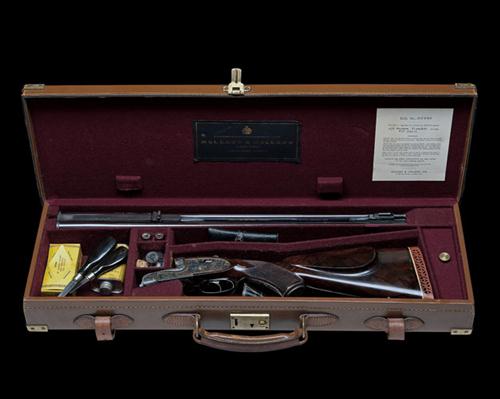 24in. nitro reproved chopperlump barrels with matt sight rib, open sights for 50 and 200 yards with folding leaf sight for 350 yards, matt ramp-mounted bead fore-sight with fold-over protector with integral moonsight, sunken rib engraved '.375 "MAGNUM" FLANGED CTGE.' and gold-inlaid '-SPECIALLY MADE FOR MR Y HARA-', tubes engraved 'HOLLAND & HOLLAND. 13. BRUTON STREET, LONDON.', treble-grip action with side-bolsters and hidden third bite, removable striker discs, elongated top strap with automatic safety and gold-inlaid 'SAFE' detail, hand-detachable lockplates, gold-inlaid cocking-indicators, chequered articulated front trigger, rolled-edge triggerguard, the fences deeply carved in relief with stylised dragons, the action, lockplates and furniture profusely engraved with bold stylised acanthus and foliole motifs, interspersed with mythical beasts and serpents, the underside with the Green Man, with the the makers name and model designation interwreathed on the action bar, the crosspin with central floral motif encircled 'MADE IN ENGLAND', retaining virtually full original colour-hardening and finish, 13 3/4in. highly-figured pistolgrip stock with cheekpiece and monte carlo comb, steel pistolgrip-cap (with trap) engraved with a further Green Man and retaining virtually full colour-hardened finish, sling swivels, 1in. ventilated rubber recoil pad, weight 9lb. 2oz. , in its lightweight leather case with accessories and canvas outer