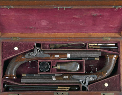 circa 1835, with possibly re-browned 10in. octagonal damascus barrels, dove-tailed fore-sights, colour-hardened hooked breeches with scroll engraved top-flats, scroll engraved colour-hardened top-tangs, notch rear-sights, platinum plugs and coiled percussion fences, flat border-line engraved colour-hardened lockplates with panels of scrolls, sliding safes behind the scroll engraved dolphin-headed hammers, walnut half-stocks with full flat-bottomed chequered pistol-grips, initialled oval escutcheons to the wrists, blued border and scroll engraved trigger-guards, set triggers, engraved finials, white-metal fore-end cap and take-down wedge escutcheons, browned under-rib and original brass-tipped ramrods TOGETHER WITH their original mahogany travelling case compartmented and lined in burgundy velvet and containing a number of period accessories including ball mould, powder-flask, loading rods and turn-screw, much original finish throughout