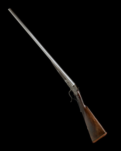 29in. nitro reproved damascus barrels (in 2014, struck off), the rib with a cartouche engraved 'THEOPs. MURCOTT'S PATENT. 68 HAYMARKET. LONDON.', and '2', 2 1/2in. chambers, bored approx. true cyl. in both, left wall thickness below recommended minimum, Theophilus Murcott patent action, patent no. 1003 of 15th April 1871, use number 7026, with push-forward underlever, manual lever safety with gold-inlaid 'LOCK'D' detail, and grip safety, action flat stamped 'TRADE MARK HAMMERLESS' and 'MURCOTT'S PATENT', profusely engraved with bold acanthus scrollwork interspersed with floral motifs and ornate bordering, the lockplates signed 'T. MURCOTT'S PATENT' in scrolling banners, 14 3/4in. stock (setting crack to rear of right lockplate) including 7/8in. rubber recoil pad (distressed), oval escutcheon engraved with an 'E' surmounted by the coronet of a Marquess, fore-end missing finial, weight 5lb. 12oz.