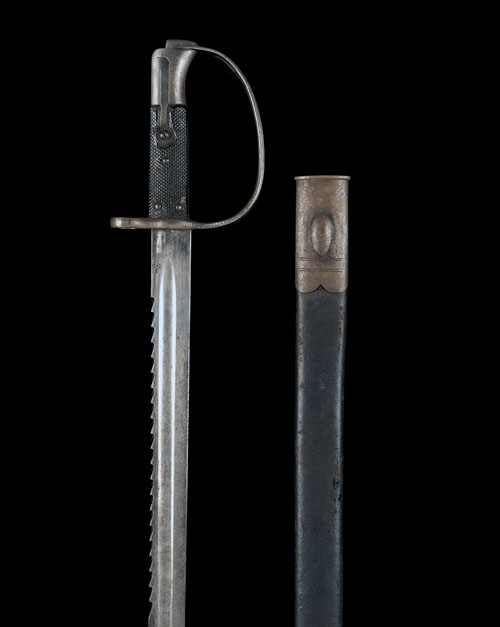 the first a pattern 1859 Cutlass bayonet for the Enfield or Snider rifles with slightly curved 26 3/4in. spearpoint blade signed 'A & F. H.', some staining, complete with iron mounted leather scabbard, the second an Artillery Carbine Pattern 1875 sword bayonet for the Martini-Henry carbine, with straight spearpointed saw-backed blade, short fuller near the 'D' shaped hilt and stamped with various inspectors marks, complete with its iron mounted leather scabbard (some pitting to hilt and mounts)