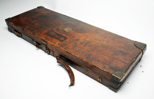 A BRASS-CORNERED LEATHER DOUBLE GUNCASE, suitable for 30in. barrels, lined with red baize, brass lock |(key missing), the interior lid with a leather gold tooled 'WILLIAM EVANS' trade label, the exterior lid with a brass escutcheon