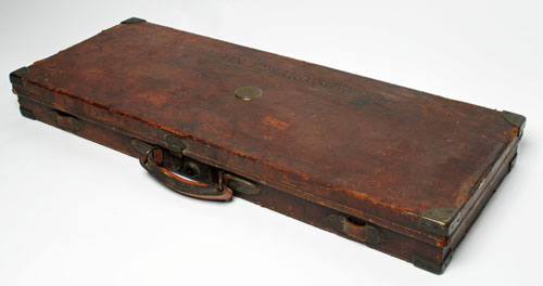 suitable for 30in. barrels, lined with maroon baize, brass lock (key missing), interior trade label missing, ther exterior lid with a brass escutcheon