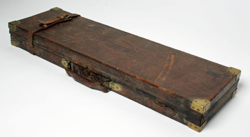 suitable for 30in. barrels, lined with maroon baize, push in double brass lock (key missing), the interior lid with a 'W. RICHARDS