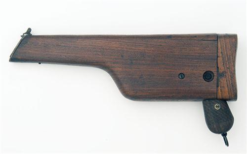 circa 1925, with 5 1/2in. stepped barrel, block and blade fore-sight, 1000 metre rear-sight, small ring hammer, new-style safety catch, machined receiver, 25 groove wood grips, lanyard ring at pommel, the whole re-finished TOGETHER WITH a period wooden holster-stock numbered '543' (some splits and repairs)