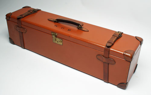 fitted for 26 1/2in. barrels, lined with maroon baize, brass lock (key missing), the interior lid with a 'GALLYON & SONS LTD' Trade label, the exterior lid with the monogram 'W.D.B.'