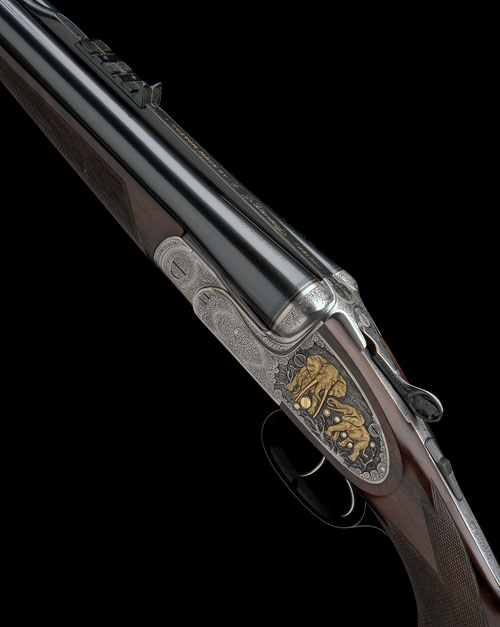 24 1/4in. Bohler Rasant steel nitro chopperlump barrels, sight rib gold-inlaid 'CUSTOM MADE BY - J FANZOJ. FERLACH' and with border engraving, open sights and three folding leaf sights with gold-inlaid sighting lines, sunken matt rib, matted ramp-mounted bead fore-sight with flip-up moonsight, treble-grip action with side-bolsters, removable striker discs, toplever pierced with the head of a snarling lioness, elongated top strap with manual safety, gold-washed cocking-indicators, articulated front trigger, the action, lockplates and furniture engraved with fine stylised acanthus scrollwork with gold-inlaid highlights, the left lockplate carved in high relief and gold-inlaid with a pair of African elephant, the right with two buffalo, the underside with a leopard with its kill, the triggerguard carved and gold-inlaid with a monogram 'E.W.', 15in. figured pistolgrip stock with cheekpiece, engraved steel pistolgrip-cap with trap gold-inlaid with the head of a wild dog, 1in. rubber recoil pad, weight 11lb. 11oz.