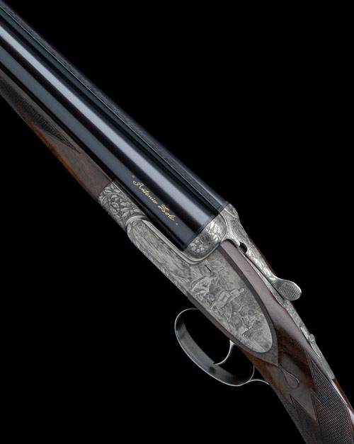 28in. nitro barrels with raised matt rib, left tube gold-inlaid 'ANTONIO ZOLI', left wall thickness at 18, 2 3/4in. chambers, bored approx. 1/4 and full choke, treble-grip action with removable striker discs and gas checks, manual safety, non-selective single trigger, the action profusely engraved with fine floral and foliate motifs on a matt background, the lockplates and underside with finely engraved bulino style scenes of Artemis and bathing Athenian girls, the triggerplate signed 'GALEAZZI '73', bright finish overall, 14 1/4in. highly-figured stock, weight 6lb. 14oz.