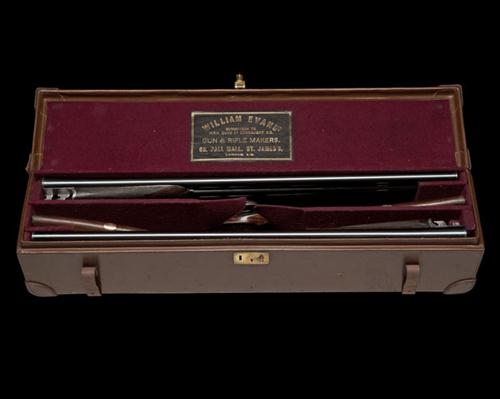 28in. nitro barrels, ribs gold-inlaid '1' and '2' and engraved 'WILLIAM EVANS. 63. PALL MALL. ST. JAMES'S. LONDON.', 2 1/2in. chambers, bored approx. imp. cyl. and 1/4 choke, treble-grip actions, toplevers gold-inlaid '1' and '2', automatic safeties with gold-inlaid 'SAFE' details, removable striker discs, best bold acanthus scroll engraving, retaining traces of original colour-hardening, 14 5/8in. figured crossover stocks, weight 6lb. 7oz., in their lightweight leather motor case