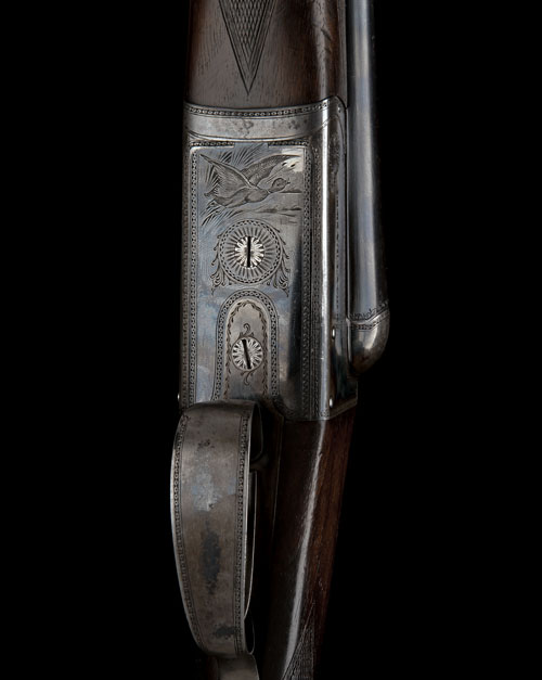 32in. nitro reproved barrels with broad matt rib, banner engraved 'G. E. LEWIS & SONS. 32 & 33 LOWER LOVEDAY ST. BIRMINGHAM.', 33in. chambers, bored approx. full choke in both, large treble-grip action with side-clips, automatic safety, beaded birder engraving, the underside with a lone duck in flight, retaining much colour-hardening and some finish, 14 3/4in. figured stock with leather cheekpiece and including 7/8in. rubber recoil pad, fore-end with Deeley & Edge patent release catch, weight 8lb. 1oz.