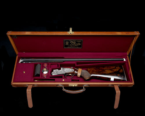 29 1/2in. nitro barrels with 10mm ventilated matt top-rib, 3in. chambers, bored approx. true cyl. and 1/2 choke, hold-open toplever gold-inlaid with a crown and pierced with a rose, automatic safety with integral barrel selector switch, gold-washed trigger, rolled-edge triggerguard, the action, lockplates and furniture deeply carved in relief with scrolling acanthus leaves, surrounding oval vignettes of duck and pheasants in flight, the triggerplate signed 'Badillini', bright finish, 15in. boldly-figured pistolgrip stock including 5/8in. rubber recoil pad, weight 8lb. 1oz., in its lightweight leather case with some accessories