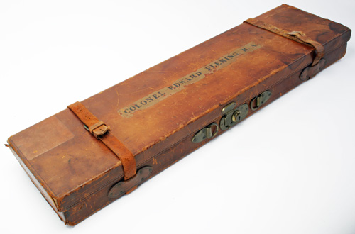 suitable for 30in. barrels. lined with red baize, central brass lock the lid interior with a 'THOMAS HORSLEY' trade label, the lid exterior with 'COLONEL EDWARD FLEMING. R.A.' handle missing