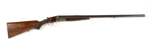 28in. black powder only barrels with raised filed rib, open sights and two folding leaf sights with silver sighting lines and marked for 100, 200 and 300 yards, bead fore-sight, treble-grip action with carved serpentine fences, slender toplever, automatic safety with gold-inlaid 'SAFE' detail, fine bouquet and acanthus scroll engraving with ornate bordering, retaining much original colour-hardening and finish, 13 7/8in. figured pistolgrip stock with cheekpiece, sling eyes and engraved steel pistolgrip-cap, including 7/8in. rubber recoil pad, bolstered fore-end with finely engraved grip-catch release lever, weight 8lb. 7oz.