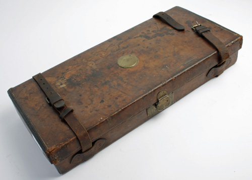 COGSWELL AND HARRISON CARTRIDGE CASE, suitable for approx. 200 cartridges, lined with green baize, brass lock (including key), the lid interior with a 'COGSWELL AND HARRISON' trade label, handle is detached and in need of repair