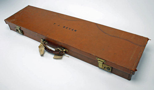 A SINGLE LEATHER GUNCASE, suitable for 28in. barrels, lined with maroon baize, the interior lid with a 'ATKIN, GRANT & LANG' trade label, the exterior lid embossed with 'T. J. BEVAN'