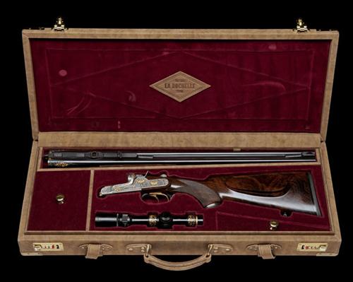 25in. nitro chopperlump barrels, profusely scroll-engraved and gold-inlaid at the breech ends, with matt sight rib, open sights and ramp-mounted gold blade fore-sight, the breech end mounted with a Leupold Vari - X III 1.5x5 telescopic sight in quickly-detachable, scroll-engraved and gold-inlaid mounts, Kronen system self-cocking treble-grip action with carved serpentine fences, sidelocks with rebounding hammers, removable striker discs, articulated front trigger, manual safety, elongated top-strap, gold-washed triggers and internals, the action, lockplates and furniture profusely carved in relief with bold acanthus scrolls and stylised leafwork with gold-inlaid details, the fore-end iron decorated en-suite, the lockplates relief-engraved and gold-inlaid with scenes of grazing plains game and prowling leopard, signed 'KRAMER', the triggerguard gold-inlaid with the serial number and 'LA ROCHELLE 1997', 14 3/8in. highly-figured pistolgrip stock with cheekpiece, sling eyes, ornately engraved steel pistolgrip-cap with gold detailing and inscribed 'SAX' in a cruciform, including 1/2in. rubber recoil pad, semi-beavertail fore-end with Deeley and Edge patent fore-end fastener, weight 9lb. 14oz., in its fitted, maroon velvet lined brass-cornered leather case with leather 'EDITION LA ROCHELLE' label and canvas outer cover
