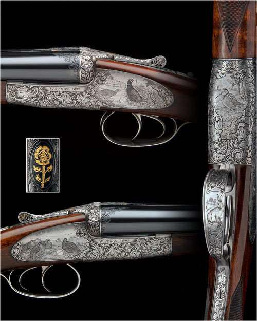28in. nitro chopperlump barrels, ribs engraved 'WATSON BROS. 39, REDCROSS WAY, LONDON BRIDGE, ENGLAND.', the breech ends chiselled in high relief with acanthus leaf motifs, serial no. 20068 gold-inlaid with an English rose and 20069 gold-inlaid with a Scottish cotton thistle, 2 3/4in. chambers, bored approx. 1/4 choke in all, signature coffin-shaped tapered rounded bar actions incorporating Purdey / Beesley self-opening systems, automatic safeties with gold-inlaid 'SAFE' details, removable striker discs, cocking-indicators, rolled-edge triggerguards, Gun No. 20068 toplever gold-inlaid with an English rose and pierced with the same, the fences finely chiselled with further rose motifs on a matt background, bold Edwardian scroll engraving surrounding and invading finely engraved vignettes of English game scenes, the left lockplate with a nye of pheasant, the right with a covey of partridge, the underside with a lone woodcock and the triggerguard with a hare; Gun No. 20069 toplever gold-inlaid with an Scottish cotton thistle and pierced with the same, the fences finely chiselled with further thistle motifs on a matt background, bold Edwardian scroll engraving surrounding and invading finely engraved vignettes of Scottish game scenes, the left lockplate with a covey of rock ptarmigan, the right with a brace of red grouse, the underside with a lone capercaillie and the triggerguard with a black grouse, the fore-ends decorated en suite, triggerplates signed 'K. THOMAS. ENG.' and the triggerguard tangs gold-inlaid with the serial numbers, 15 1/4in. highly-figured stocks, weight 5lb. 15oz., in their brass-cornered oak and leather case with blue baize lining, full complement of accessories and with a canvas and leather outer