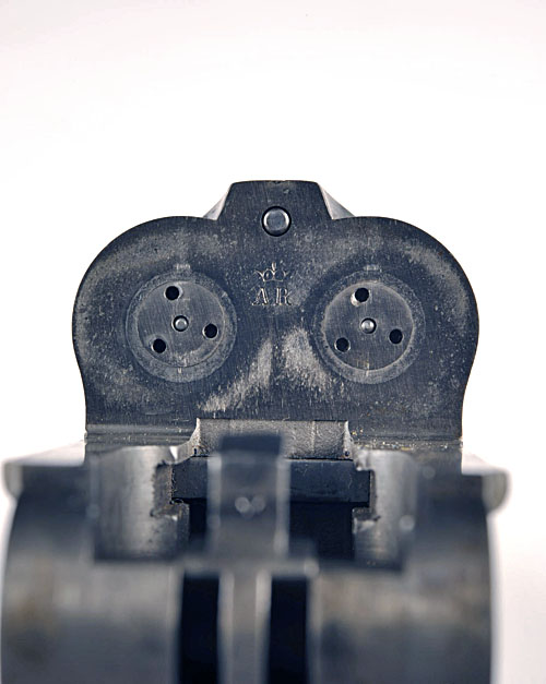 25 1/2in. nitro barrels with matt sight rib, open sights and folding leaf sights for 100, 150 and 200 yards, ramp-mounted bead fore-sight, telescopic sight mount bases, scroll-back bolstered action, hold-open toplever, manual safety, removable striker discs, acanthus scroll engraving, bright finish, 15in. pistolgrip stock with cheekpiece, engraved steel pistolgrip-cap (with trap) and including 1/2in. rubber recoil pad, beavertail fore-end, weight 8lb. 12oz.