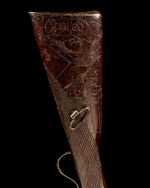 last decade of the 19th century (date obscured), with 25in. sighted barrel, action marked 'WESTLEY RICHARDS & CO.' on the left side and 'SPECIALLY MADE FOR ZAR' on the right side, all the exposed iron surfaces deeply pitted and corroded, walnut butt-stock, the left hand side carved with 'C P DREIJEH TAUTESBERG, 1-1-1901' within a heart-shaped device, the right hand side carved with 'ORLOG' within a surround shaped like a bullet together with a bust of a gentleman in formal dress and a rectangular panel with the dates '1899, 1900, 1901' within it, the stock and three-quarter fore-end amateurly chequered by the same hand, missing clearing rod and other minor losses