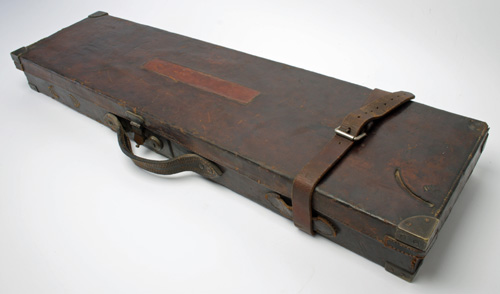 A BRASS CORNERED SINGLE LEATHER GUNCASE, suitable for 29in. barrels (can adapt to up to 31in), lined with green baize, brass lock (key missing), one brass corner missing, the interior lid with a 'JEFFERY & CO' trade label