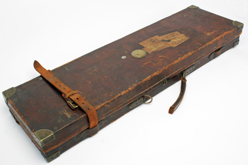fitted for 30in. barrels, lined with red baize, central brass lock (key missing), the lid interior with a gold tooled leather 'CHARLES HELLIS' trade label, together with a 'CHARGES' label for no. 12534, the lid exterior with the monogram 'W.H.L.' and a blank brass escutcheon, handle broken
