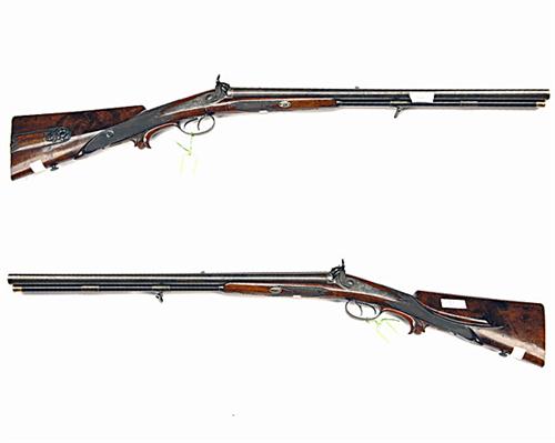 circa 1850, with 24 1/4in. etched twist-steel barrels, the variegated broad damascus top-rib inlaid in gold with 'M. NOWOTNY IN WIEN' together with the number '2', dove-tailed fore-sight with silver blade and zeroing marks, dove-tailed standing notch rear-sight with additional folding leaf, a mountain goat engraved to the breech-end, fully scroll engraved long top-tang with central number '2', platinum vents, fully scroll and game-scene engraved back-action locks signed 'NOWOTNY' on the right hand side forwards of the hammer and 'IN WIEN' on the left hand lock, the right hand lock featuring a hunting dog flushing a stag from woodlands, the left hand lock with three deer in a woodland setting, scroll engraved dolphin-headed hammers, chequered walnut half-stock with carved raised cheek-piece, the end of the grip-piece flared and carved, sliding carved wood patchbox lid, iron heel-plate engraved with floral scrolls and a wild boar in a woodland setting on the tang, applied wooden pistol-grip to the trigger-guard tang, trigger-guard bow engraved with a bolting deer, double triggers (set for the right hand barrel), vacant clipped-corner square escutcheon set into the fore-end chequering, scroll engraved ramrod throat, etched damascus thimbles and original brass-tipped ebony ramrod