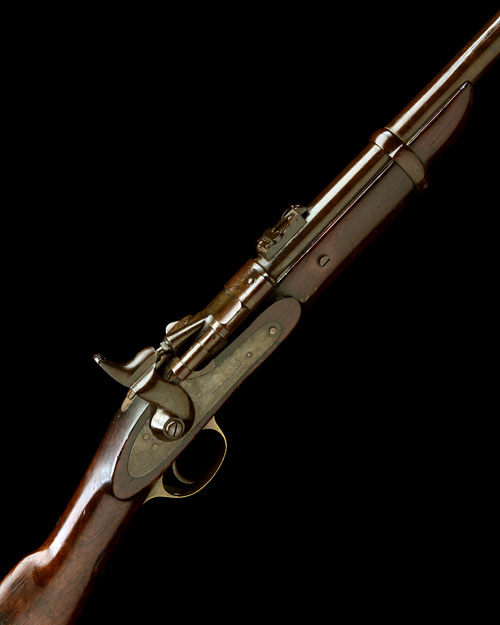 circa 1870, with round 18 1/2in. barrel, block and blade fore-sight, elevating ladder rear-sight, hinged breech-block with sprung locking catch signed 'SNIDER'S PATENT', plain flat military-style lock signed 'I. HOLLIS & SONS' forwards of the hammer together with 'MAKERS TO HER MAJESTY'S WAR DEPARTMENT' in a circle surrounding the I. Hollis monogram to the tail, plain hammer, walnut half-stock with brass furniture, iron saddle-bar and ring to left hand side, provision for leather dust cover (missing), iron barrel-band and no provision for ramrod