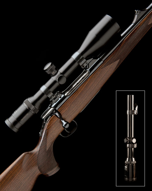 23 3/4in. nitro barrel ported at the muzzle, open sights and ramp-mounted bead fore-sight, the receiver mounted with a Swarovski 3-12x50 Habicht illuminated reticule telescopic sight in quickly-detachable mounts, set trigger, detachable box magazine (with spare), blued finish, figured pistolgrip stock with hogsback comb and cheekpiece, sling swivels, 15 1/8in. pull including 7/8in. ventilated rubber recoil pad, with original buttplate, spare buttplate and paperwork for the rifle and telescopic sight; together with a second Zeiss Diavari-C 1,5...4,5x18 telescopic sight for driven game (with mounts to fit), in its leather 'scope case