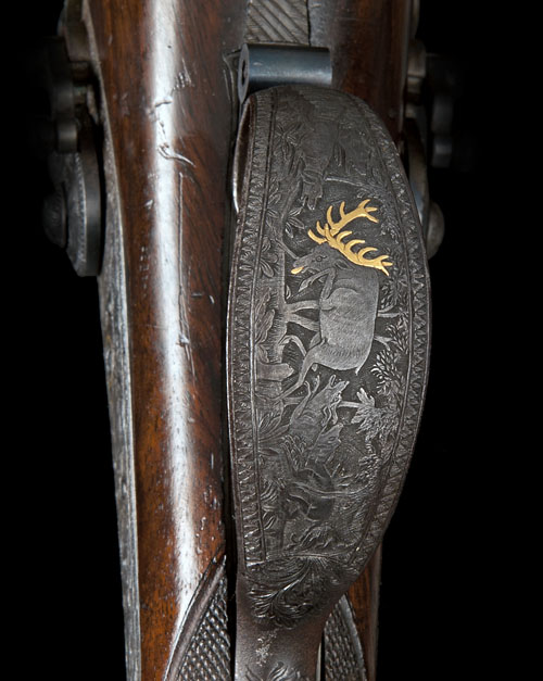 circa 1840, with re-browned 28in. damascus barrels, the top-ribs signed in gold 'TANNER IN HANNOVER', white metal dove-tailed fore-sights, dove-tailed rear-sights, gold floral inlays and lines at the engraved breeches, fully carved and engraved top-tangs featuring various game animals with gold accents and isolated gold framing, border and game-scene engraved back-action locks with some screws and pins framed in gold, carved and engraved hammers with gold accents, swinging safes forwards of the hammers, highly figured semi-pistol grip chequered half-stocks with raised cheek-pieces, fully game-scene engraved iron heel-plates with scroll engraved long top-tangs, circular silver floral engraved escutcheons set into the pommels of the grips, border, scroll and game-scene engraved trigger-guard bows with gold inlays, set-trigger to first barrel, gold oval escutcheons engraved with the crest of Ernst August Elector of Hannover, Duke of Brunswick to the fore-ends, white-metal engraved fore-end caps and original nickel tipped ramrods, much original colour to the metalwork except where noted