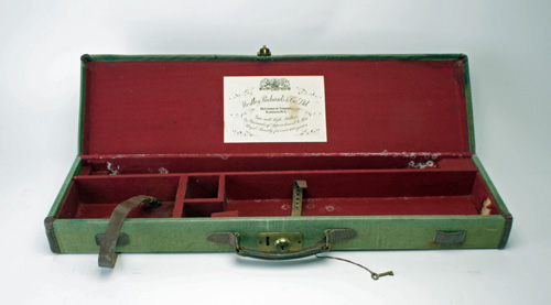 A 'WESTLEY RICHARDS & CO LTD' CANVAS AND LEATHER SINGLE GUNCASE, suitable for 26in. or 29in. barrels, the interior lined with red baize, brass lock (including key), the lid interior lid with a 'WESTLEY RICHARDS & CO LTD' trade label, straps missing