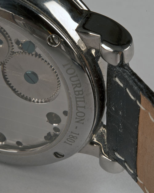 Other Notes: In horology, a tourbillon (or "whirlwind" in French) is an addition to the mechanics of a watch escapement. Developed around 1795 by the French-Swiss watchmaker Abraham-Louis Breguet from an earlier idea by the English chronometer maker John Arnold, a tourbillon trys to counter the effects of gravity by mounting the escapement and balance wheel of the watch movement in a rotating cage, to negate the effect of gravity when the timepiece (and thus the escapement) is left in a certain position. Originally an attempt to improve accuracy in pocket watches, tourbillons are still included in some expensive modern watches as a novelty and demonstration of the pinnacle of watchmaking virtuosity. The tourbillon cage and balance wheel are usually exposed on the watch's face to show off the intricate mechanism.