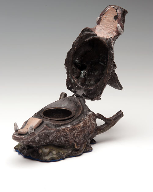 A COLD-PAINTED BRONZE INKWELL IN THE FORM OF A WILD-BOARS HEAD,