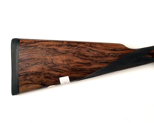 29in. nitro chopperlump barrels with matt rib, 2 3/4in. chambers, bored approx. 1/4 and 1/2 choke, automatic safety with gold-inlaid 'SAFE' detail, removable striker discs, hand detachable sidelocks, gold-inlaid cocking indicators, articulated front trigger, bouquet and scroll engraving, bright finish, 14 3/4in. figured stock including 1/2in. rubber recoil pad, weight 6lb. 9oz.