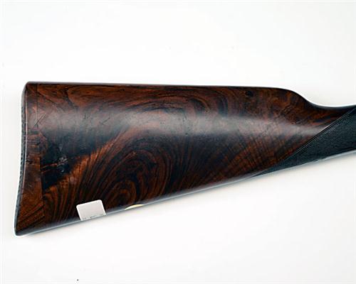 27 1/2in. nitro chopperlump barrels, 2 3/4in. chambers, bored approx. true and imp. cyl., automatic safety with gold-inlaid 'SAFE' detail, removable striker discs, gold-inlaid cocking-indicators, articulated front trigger, rolled-edge triggerguard, bouquet and scroll engraving, retaining traces of original colour-hardening and finish, 14 1/2in. stock including 1/4in. wooden extension, weight 6lb. 10oz.