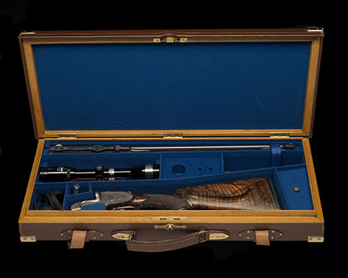 25in. blued nitro barrels with raised sight rib with bright steel finish, finely engraved open sights with folding leaf sight, and ramp-mounted bead fore-sight with flip-up moonsight, the breech end mounted with a Zeiss Diavari-C 3-9x36 T* telescopic sight in exquisitely engraved bright steel finish quickly-detachable mounts, the rib signed by the maker, the breech end with floral and scroll flourishes, treble-grip action with hidden third bite, side-bolsters, finely carved serpentine fences, removable striker discs, elongated top strap, automatic safety, gold-inlaid cocking-indicators, articulated front trigger, the action, lockplates and furniture exquisitely engraved with tight acanthus scrollwork and floral bouquets and with fine gold highlighting, the fore-end decorated en suite, the left lockplate signed 'W. GLANZNIG' in a scrolling banner, the triggerplate signed 'J. Deflorian', 14 1/2in. highly-figured pistolgrip stock with fluted grip, cheekpiece, finely engraved steel pistolgrip-cap and sling swivels, including 1/2in. rubber recoil pad, fore-end with Deeley & Edge patent release catch, weight 10lb. 2oz., in its brass-cornered oak and leather case, with 'passport' signed by the maker