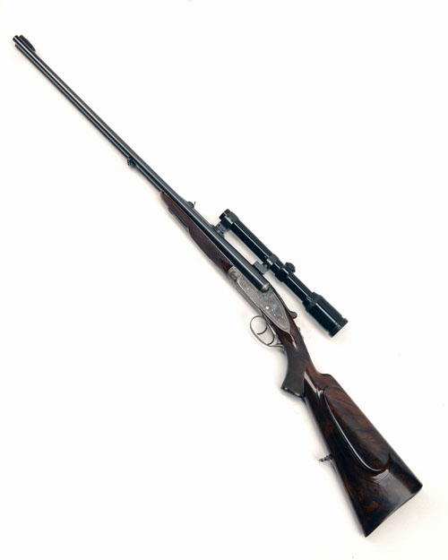 26in. nitro reproved chopperlump barrels (converted to 9,3x74R from .350 calibre in 1975), raised sight rib engraved in gothic script 'JNo. RIGBY & CO. 43 SACKVILLE STREET. LONDON.W.', open sights and ramp-mounted bead fore-sight, the breech end mounted with a Zeiss Diavari-C 1,5..4,5x18 telescopic sight in quickly-detachable mounts, tubes engraved 'CAL 9,3X74R REGULATED FOR 285 GRAIN BULLET', treble-grip action with rounded bar, removable striker discs, carved leaf fences, automatic safety with push button release and gold-inlaid 'SAFE' detail, dipped-edge lockplates, refreshed acanthus scroll engraving, retaining much renewed colour-hardening and finish, 15in. highly-figured replacement pistolgrip stock (and matching fore-end wood) with cheekpiece, sling swivels, the fore-end with ejector / non-ejector selector nut and grip-catch release, weight 10lb. 6oz.