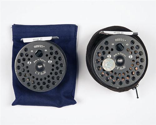 TWO ORVIS FLY FISHING REELS, made by Orvis , C.F.O. IV one in a brown reel case the other in a blue cloth pouch