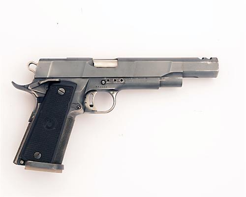 A .38 (SUPER) SEMI-AUTOMATIC COMPETITION 'RACE-GUN' SIGNED PARA-ORDNANCE, serial no. WF1509, circa 1996, with custom 5in. barrel, blued lightened slide with matching compensator, 'Para-Ordnance' frame drilled for an optical sight mount, ambidextrous safety-catch, extended beavertail, lightened hammer, extended magazine-release, chequered plastic grips, chequered front and back-straps and flared magazine well