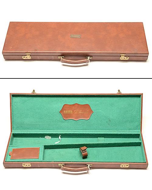 A TAN LEATHERETTE SINGLE GUNCASE, suitable for 30in. barrels, lined with green baize, two brass locks (keys missing)