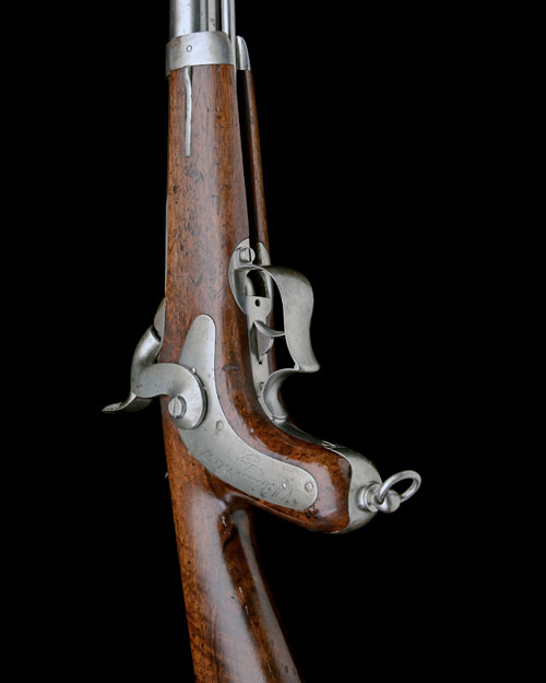 circa 1840, with round tapering 15 3/4in. barrel rifled for Delvigne's Patent expanding bullet, bead fore-sight, octagonal breech-section with elongated top-tang encompassing a click-adjustable notch rear-sight, boomerang-shaped sidelock signed 'N. M. LESOINNE ET PIRLOT FILS A LIEGE', plain hammer, figured walnut half-stock with squared iron heel-plate, bag-shaped pistol grip with iron grip-plate of similar form to the lockplate and lanyard ring to base, asymmetric trigger-guard bow retaining one end of the under-barrel stirrup, double-ended iron ram-rod, iron nose-band to fore-end, brushed bright finish throughout