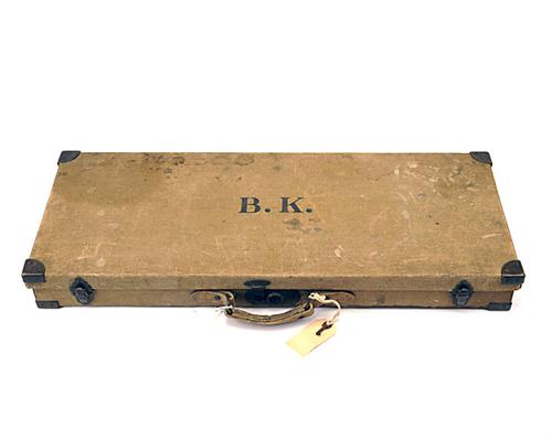 A BRASS CORNERED GREEN CANVAS DOUBLE GUNCASE, suitable for 28in. small bore barrels, the interior lined with red baize (moth damage), brass lock (including key), the lid interior with a 'CHARLES & H. WESTERN' trade label, the exterior with the initials 'B.K.'