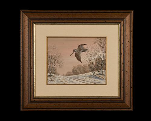 a set of two signed acrylic on board showing a woodcock in flight in a winter setting, signed MARK CHESTER' with 'EVENING FLIGHT' and 'THROUGH THE TREES' 'an original painting by Mark Chester' inscribed on the back, with a dark wood frame