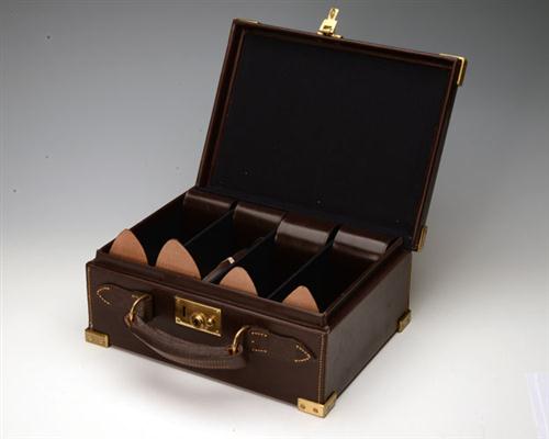 suitable for approx, 200 cartridges, brass lock (key missing), lined with blue baize and blue canvas, three removable dividers, four leather lifters,