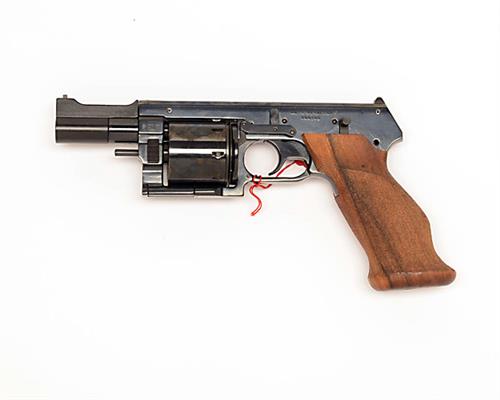 A SCARCE .38 (SPL) EIGHT-SHOT DOUBLE-ACTION TARGET REVOLVER, SIGNED MATEBA, ITALY, serial no. 000202, for 1984, with 3in. blued barrel, muzzle-shroud with sighting rib and adjustable fore-sight combined, plain blued under-slung cylinder, unique folded blued steel frame marked 'MATEBA MACCHINE TER MO BALISTICHE' over 'MADE IN PAVIA, ITALY', external indexing link on left-hand side, twin single-action cocking bars to rear of frame, fixed rear-sight and one-piece stippled walnut ergonomical grip, the whole appearing unfired and complete with its manufacturers abs travel case, eight round clips and instructions