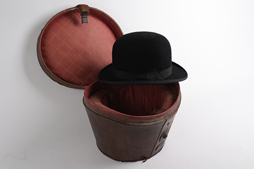 A VINTAGE BOWLER HAT COMPLETE WITH LEATHER STORAGE BOX,