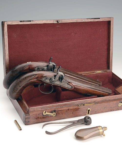 circa 1800 and converted from flint by drum and nipple, with octagonal twist 7in. barrels, the top-flats engraved 'LONDON', bead fore-sights, standing notch rear-sights to the hooked breeches, border engraved breech-ends, the South African registration numbers engraved in script to the left hand flats near breech, engraved top-tangs, slightly curved bevel-edged border engraved rounded step-tailed lockplates signed 'CLARK', sliding safes behind the scroll engraved hammers, walnut full-stocks with chequered bag-shaped butts, rectangular silver escutcheons engraved with an 'AAB' monogram, border and scroll engraved iron trigger-guard bows with pineapple finials, captive iron stirrup swivel ramrods (one pistol with loss to wood along leading edge of fore-end) COMPLETE WITH their original oak storage case, re-stained and re-lined in burgundy baize, compartmented in the English manner and retaining a bag-shaped flask, bullet mould and the tip of the original wood rammer, the lid of case with flush-folding rectangular handle and pointed escutcheon engraved 'MR H. BAGSHAWE'