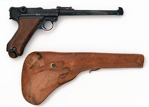A 9mm (PARA) SEMI-AUTOMATIC SERVICE PISTOL SIGNED 'DWM', MODEL 'P08 LANGE 'ARTILLERY LUGER" , serial no. 1323, dated for 1917, with 8in. barrel (rear-sight replaced), older reblued finish, chequered wooden grips, matching numbers throughout except magazine, the magazine with later wooden base, in modern leather holster.